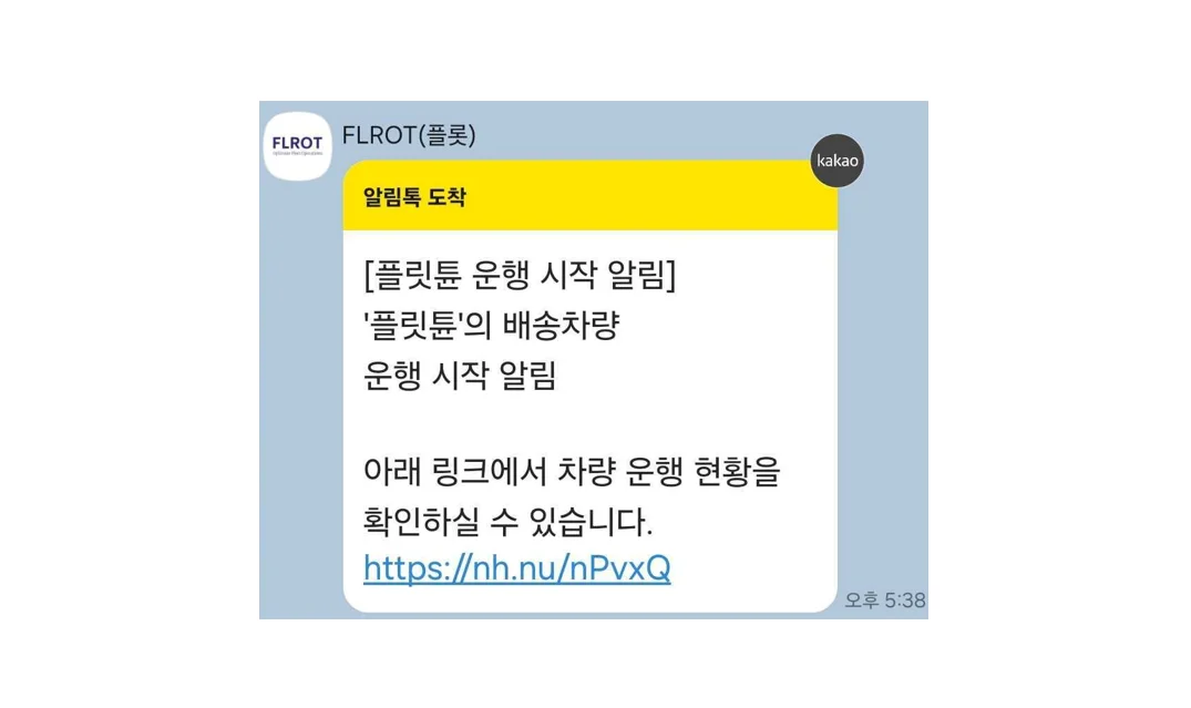 배송 출발: 배송 차량이 출발하면 플릿튠TMS에서 자동으로 카카오톡 링크가 발송됩니다.